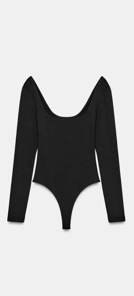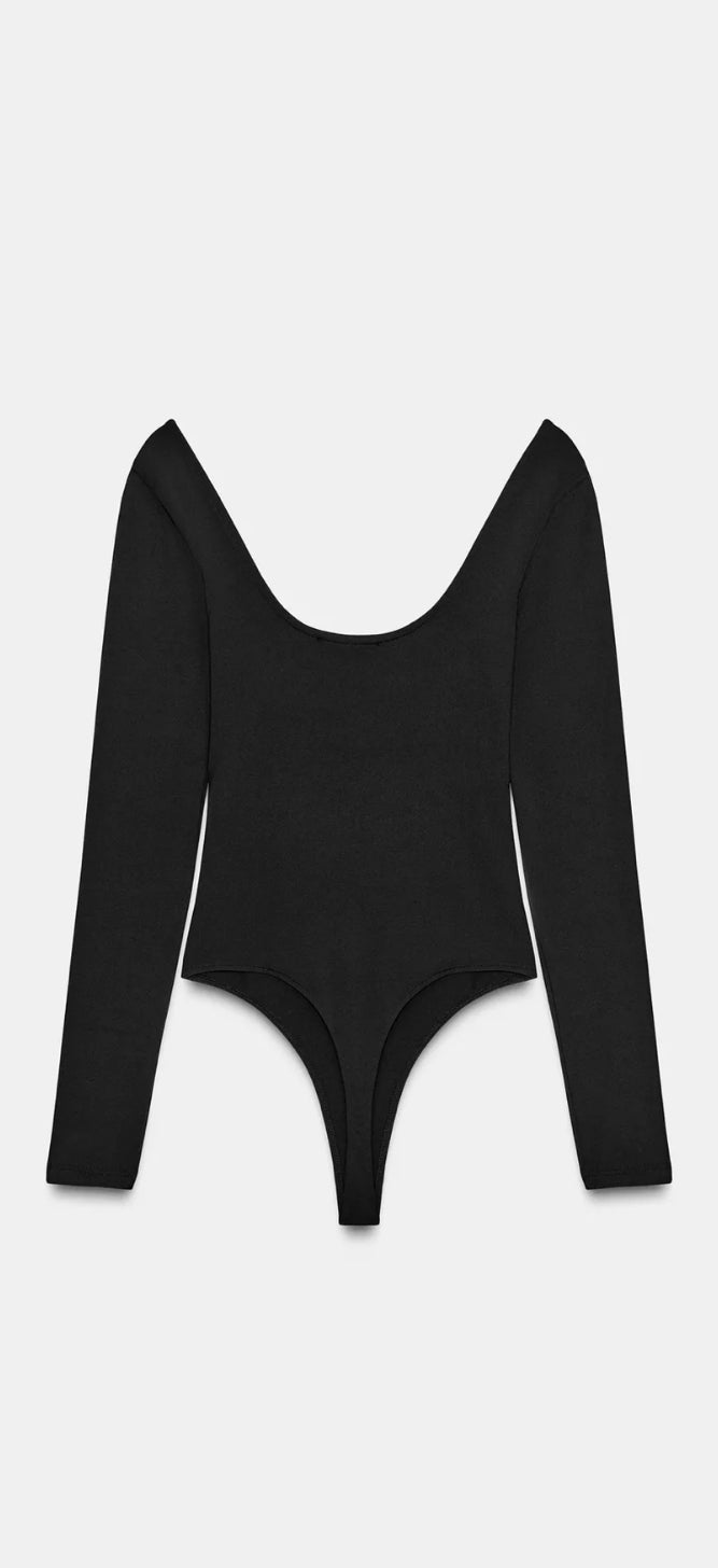 Body elegante a manica lunga realizzato in tessuto elasticizzato e morbido al tatto. Caratterizzato da uno scollo profondo sia sul davanti che sul retro, valorizza la silhouette con una linea essenziale e moderna. Il taglio minimal e il design aderente lo rendono perfetto da abbinare a pantaloni sartoriali, gonne midi o denim a vita alta.
