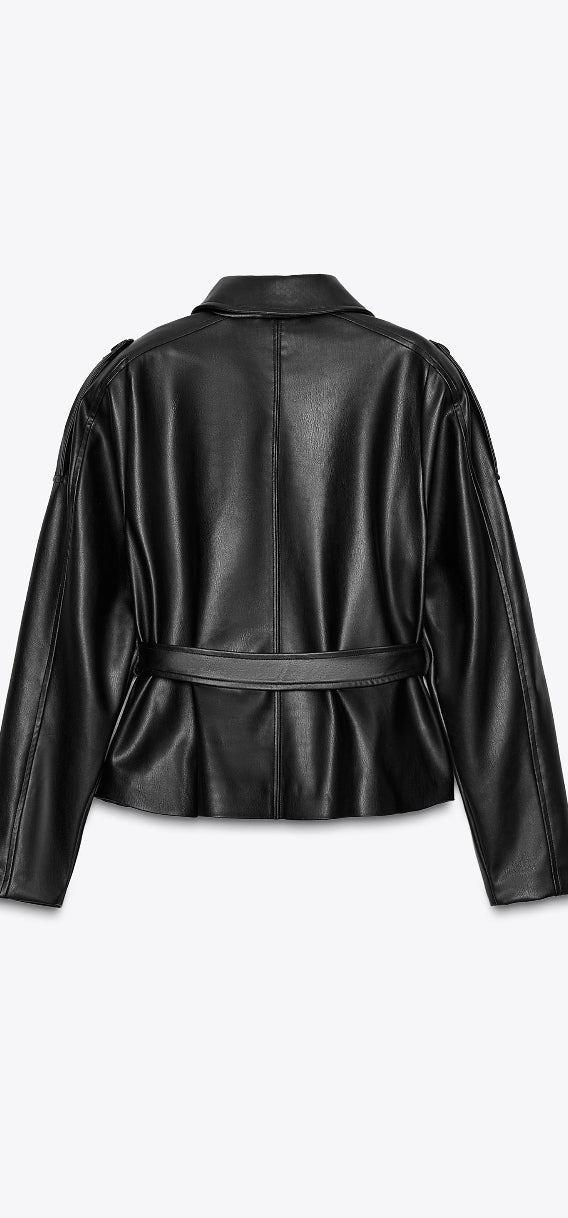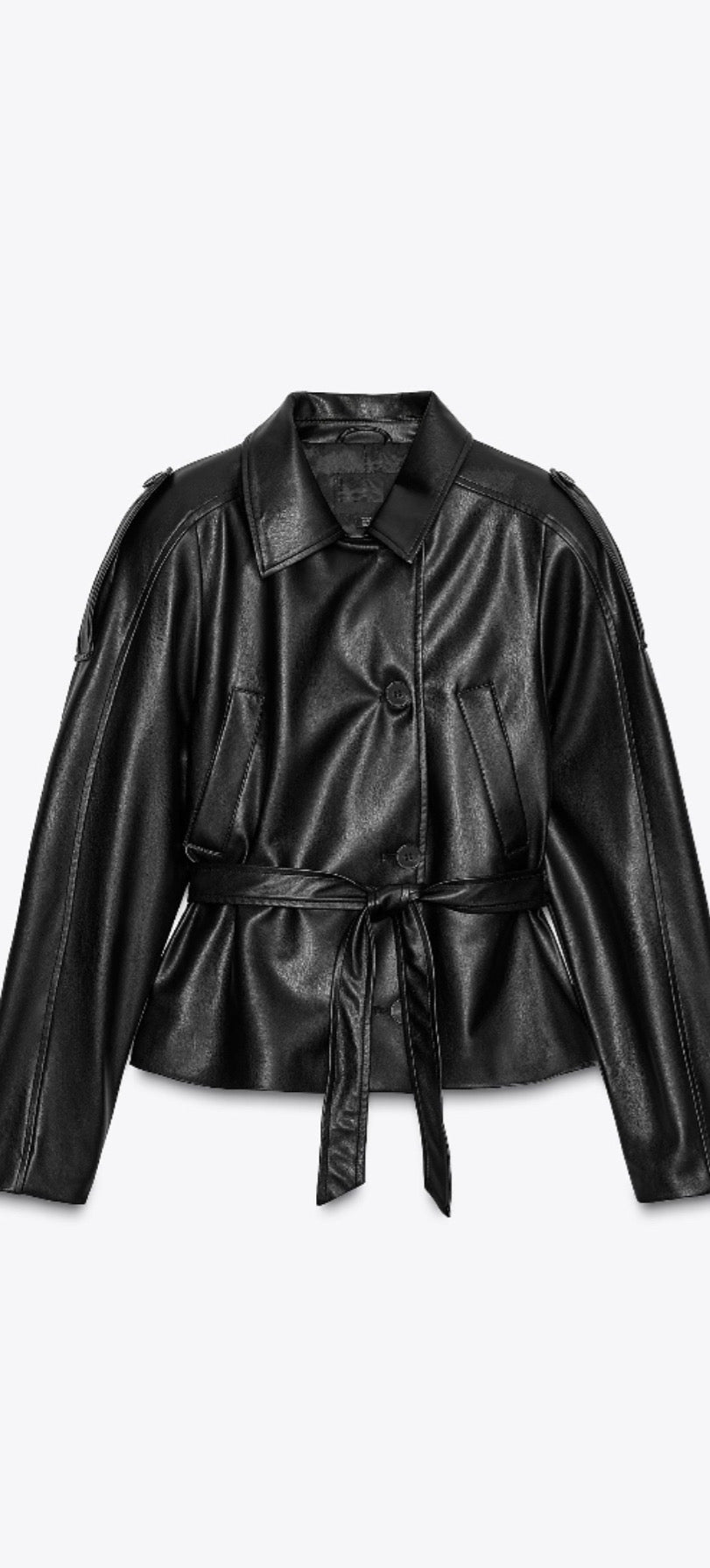 Realizzata in morbida ecopelle effetto liscio, questa giacca corta con cintura in vita unisce struttura e fluidità. Il colletto classico e le spalle leggermente scese aggiungono un tocco contemporaneo, mentre la cintura sottile definisce la silhouette.